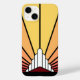 An iconic pattern of the sun rising from behind a stylized art deco shaped building. A simple yet elegant design, true to the era.
