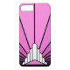 An iconic pattern of the sun rising from behind a stylized art deco shaped building. A simple yet elegant design, true to the era.