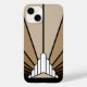An iconic pattern of the sun rising from behind a stylized art deco shaped building. A simple yet elegant design, true to the era.