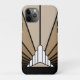 An iconic pattern of the sun rising from behind a stylized art deco shaped building. A simple yet elegant design, true to the era.