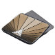 An iconic pattern of the sun rising from behind a stylized art deco shaped building. A simple yet elegant design, true to the era.