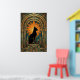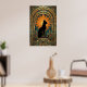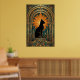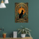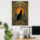 This striking art deco cat artwork showcases a black feline sitting proudly on a geometric pedestal, framed by a dramatic gold sunburst halo and ornate arches. Rich teal and amber tones echo classic 1920s design for a luxurious vintage feel. Perfect for cat lovers and art deco interiors, this piece adds instant elegance to any living room, office or hallway.