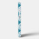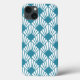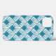 This phone case has an art deco design of diamonds with diagonal lines that look like fans in teal on a field of white.