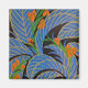 Large blue and tan leaves and bright orange flowers against a black background remind me of a surreal tropical night.