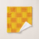 This towel set has an art deco design that looks like a weave in red and yellow on a field of gold.