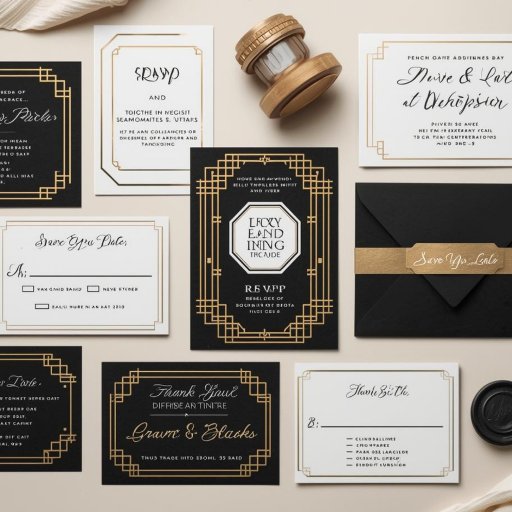 Featuring bold geometric patterns and metallic accents inspired by the 1920s Gatsby era, this design sets the tone for a sophisticated celebration.
