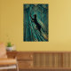 A contemplative black cat silhouette perches on a geometric teal windowsill gazing outward, framed by stylized golden curtain folds and orange sunset rays. This elegant 1920s scene brings peaceful sophistication to bedrooms, hallways and living spaces.