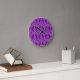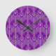 This clock has an art deco design of diamond shapes and lines in silver on a field of purple.