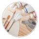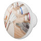 Ceramic knob with an image of different art material, including brushes, scalpels, and easel and some tubes of oil paint.