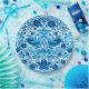 of stylised birds, flowers, strawberries, and leaves, digitally enhanced and coloured in shades of indigo turquoise and cobalt blue, on a white background