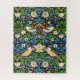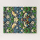 Puzzle in a William Morris Art Nouveau tapestry pattern of stylized birds, flowers, strawberries, and leaves in soft shades of blue, green, beige and tan on a dark indigo blue background
