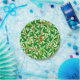 Paper plates in a William Morris Art Nouveau tapestry pattern of exotic birds in a pomegranate tree, with emerald green leaves, birds and fruit in lime green and deep ruby red, and a pastel lime green background