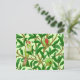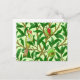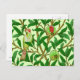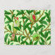 Postcard in a William Morris Art Nouveau tapestry pattern of exotic birds in a pomegranate tree, with emerald green leaves, birds and fruit in lime green and deep ruby red, and a pastel lime green background
