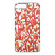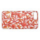 Phone case in a William Morris Art Nouveau tapestry pattern of exotic birds in a pomegranate tree, with deep mandarin and coral orange, and mustard gold leaves, birds and fruit in deep orange and white, and a white background