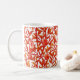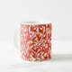 Coffee mug in a William Morris Art Nouveau tapestry pattern of exotic birds in a pomegranate tree, with deep mandarin and coral orange leaves, birds and fruit in orange and white, and a creamy white background