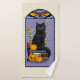 A black cat sitting on a pile of books with a red candle, pumpkins, black eyed susans and a stain glass butterfly in a backdrop of purple and light yellow.