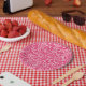 Paper plates in an Art Nouveau pattern of flowers, oak branches and leaves, based on a vintage William Morris textile design, digitally enhanced and coloured in deep fuchsia pink on a soft pastel pink background