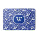 Digital reproduction of an Art Nouveau damask pattern bath mat with a striated, Ikat woven texture and a custom monogram - White on a deep cobalt blue background