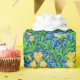 Wrapping paper in a William Morris textile print of irises and leaves, digitally enhanced and coloured, in golden yellow, green, and soft blue, on a deep cobalt blue background