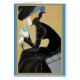Super vintage art nouveau illustration of a lady in a lovely black dress and hat drinking tea.