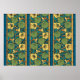 The striking contrast between the golden yellow petals, lush green foliage, and the vibrant teal and cerulean blue background creates a stained-glass effect that is both decorative and sophisticated. Perfect for maximalist interiors, Art Nouveau collectors, or anyone looking to add a touch of early 20th-century French flair to their space. This timeless botanical illustration brings a sense of artisanal craftsmanship and natural harmony to any product.