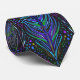 elegant men's tie printed with large, art nouveau inspired peacock feathers in purple, blue, and green, against black.