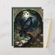 A raven with fantastic, irridescent feathers perches in a gnarled tree under a full moon. An art nouveau arch frames the scene. The back is plain dark green, without an image or texture. Beautiful, Gothic image.