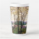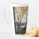 Gorgeous Art Nouveau Tiffany Stained Glass fine art Window Reproduction of Iris Flowers next to a lake, with flowering Magnolia Trees above, is on this Stained Glass Floral Latte Mug. Images are public domain due to expired copyright.