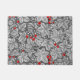 Doormat in an Art Nouveau pattern of strawberry plants, with leaves, flowers and berries, based on a vintage William Morris textile design, digitally enhanced and coloured in black and white, with a dark graphite grey /grey background, and an accent of deep red berries