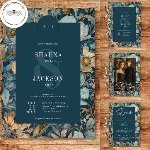 Indulge in the enchantment of the past with our vintage floral wedding save the date cards. Inspired by the iconic designs of William Morris, these invitations feature a mesmerising blend of vintage hues - deep teal blues, soft tans, golds, and creams. The intricate floral patterns, reminiscent of the Art Nouveau era, exude a touch of darkness, adding a mysterious allure to your special day. The dark teal text area, adorned with elegant vintage script, provides a striking contrast against the rich floral backdrop. This timeless design captures the essence of classic romance, making it the perfect choice for couples seeking a truly unique and unforgettable invitation. Created by Simply Farmhouse Press.