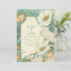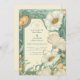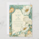 A striking Art Nouveau wedding design featuring bold white poppies with flowing teal vines and golden accents. The intricate botanical frame adds a vintage, artistic touch, ideal for couples looking for a romantic yet dramatic floral wedding theme.