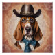 A whimsical Basset Hound named Art wearing glasses, a hat and tie.