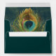 Artful and unique peacock theme beautiful wedding invitation and matching accessory set. Features stylish, rich and luxurious artwork of a peacock feather detail in colours of cobalt blue, teal and celadon light green. Background in dark aqua blue with an antique wash and swirly design. © 2010 www.CustomInvitesOnline.com