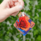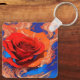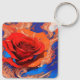 Artistic keychain features AI generated digital abstract marbled red and orange rose in full bloom on blue background.