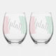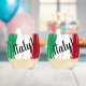 Stylish stemless wine glass set features artistic brushstroke version of the flag of Italy with customisable text overlay