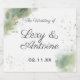 This unique wedding sparkling wine label is chic and elegant, featuring artistic and modern moss green watercolor splashes with gold botanicals and gold dust splatters. All typography in charcoal is customisable for you to personalise it.