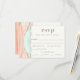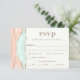 A unique artistic wedding RSVP card featuring an abstract painted watercolor design in striated shades of adobe, peach, beige and mint green. Shimmering golden lines divide the layered colours to add beautiful detailing. The design is both simple and elegant with a minimalist look. The text template included in this response card has entries for your guest to select their meal preference. You can personalise the text with your planned entree choices. If you need to re-arrange or re-centre the text after making your changes, choose "click to customise further" at the bottom of the design template to open up the design and make additional edits as needed.