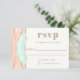 A unique artistic wedding RSVP card featuring an abstract painted watercolor design in striated shades of adobe, peach, beige and mint green. Shimmering golden lines divide the layered colours to add beautiful detailing. The design is both simple and elegant with a minimalist look. Personalise the text template with your required response date.