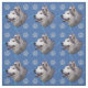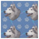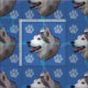 A cute artistic rendition of the head of a Husky against a blue background with paw prints and tracks in grey, blue and pink.