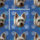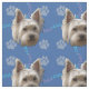 This is a fun, cute portrait of a Westie West Highland White Terrier on a blue background with paw prints and tracks in grey, pink and blue. Design by Diane Blackman. The same design is available with other fun dog images.