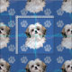 This fun, cute artistic style Shih Tzu head smiles against a background of blue with paw prints and tracks in grey, lue and pink. Design by Diane Blackman.