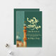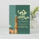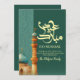 A unique watercolor-style illustration featuring a tall, textured minaret and a teal dome. The vertical split design with Arabic calligraphy patterns makes for a creative and culturally rich holiday card.