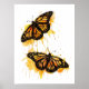 The design features two vibrant monarch butterflies in mid-flight, rendered with artistic paint splatters in warm shades of orange and yellow. This nature-inspired graphic captures the delicate elegance of spring wildlife. It makes a wonderful gift for gardeners, entomology enthusiasts, nature lovers, or anyone who appreciates the symbolism of freedom and change.