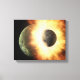 Artist's concept of a celestial body colliding into a planet sized body featured with explosion.