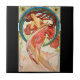 1898 Art Nouveau lithograph poster by Czech artist, Alphonse Mucha (1860-1939). Beautiful woman in a red dress, flowers in her long, flowing, bright red hair, her back arched, looking over bared shoulders, standing on her toes.