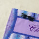 Fun, artsy beach towel has streaks of blue, lavender, purple and white watercolor paints. Droplets of paint are also spattered about.