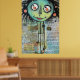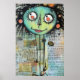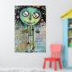 A whimsical character with large, uneven eyes and scribbly black hair dominates the foreground against a collage-like background filled with text and abstract elements. Pops of orange and red in the form of spirals and circles add a playful touch to the overall dark and eclectic vibe of the piece.