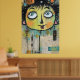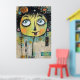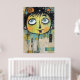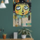A whimsical female character with large expressive eyes and colourful features is depicted against a background filled with text and abstract elements. The playful nature is enhanced by the presence of flowers in the hair and a bright mix of yellow, orange, and blue tones throughout.