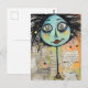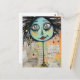 A whimsical female character with large, expressive eyes and a playful array of scribbles and circles for hair dominates the foreground. Background elements include collaged notebook pages and abstract motifs that suggest an imaginative, storytelling quality.