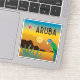 Aruba colourful illustration with a rocky beach, sun, aloe plants, a brown throated parakeet and the four pointed star from the flag of Aruba. The name Aruba is in a vintage font.
